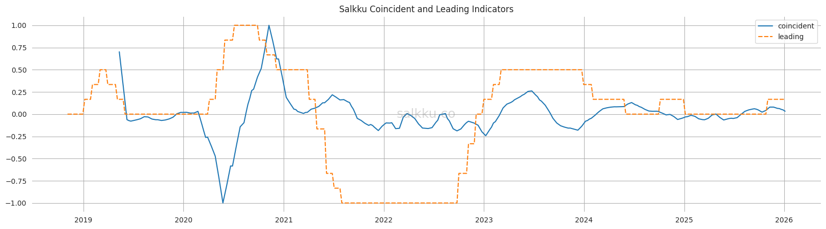 As of January 04, 2026, the Salkku Coincident Indicator recorded a positive reading of 0.8, continuing with strong Q4 readings. This reading is consistent with ongoing global expansion, corroborated by recent PMI data showing the J.P. Morgan Global Composite Output Index at 52.0 in December 2025 (released in January 2026), though slightly lower than prior months, reflecting moderated but still positive momentum.